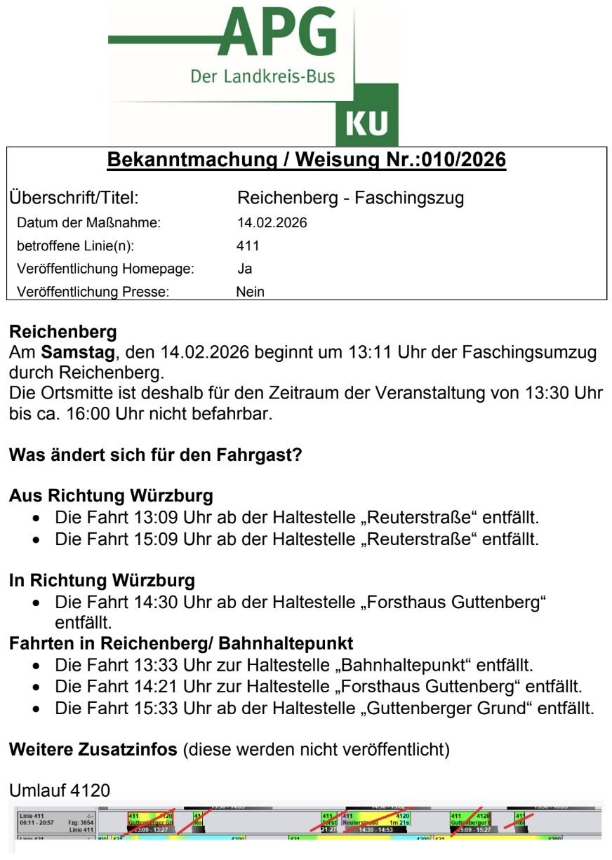 Bekanntmachung – Busverkehr in Reichenberg am 14.02.2026 (Faschingszug)