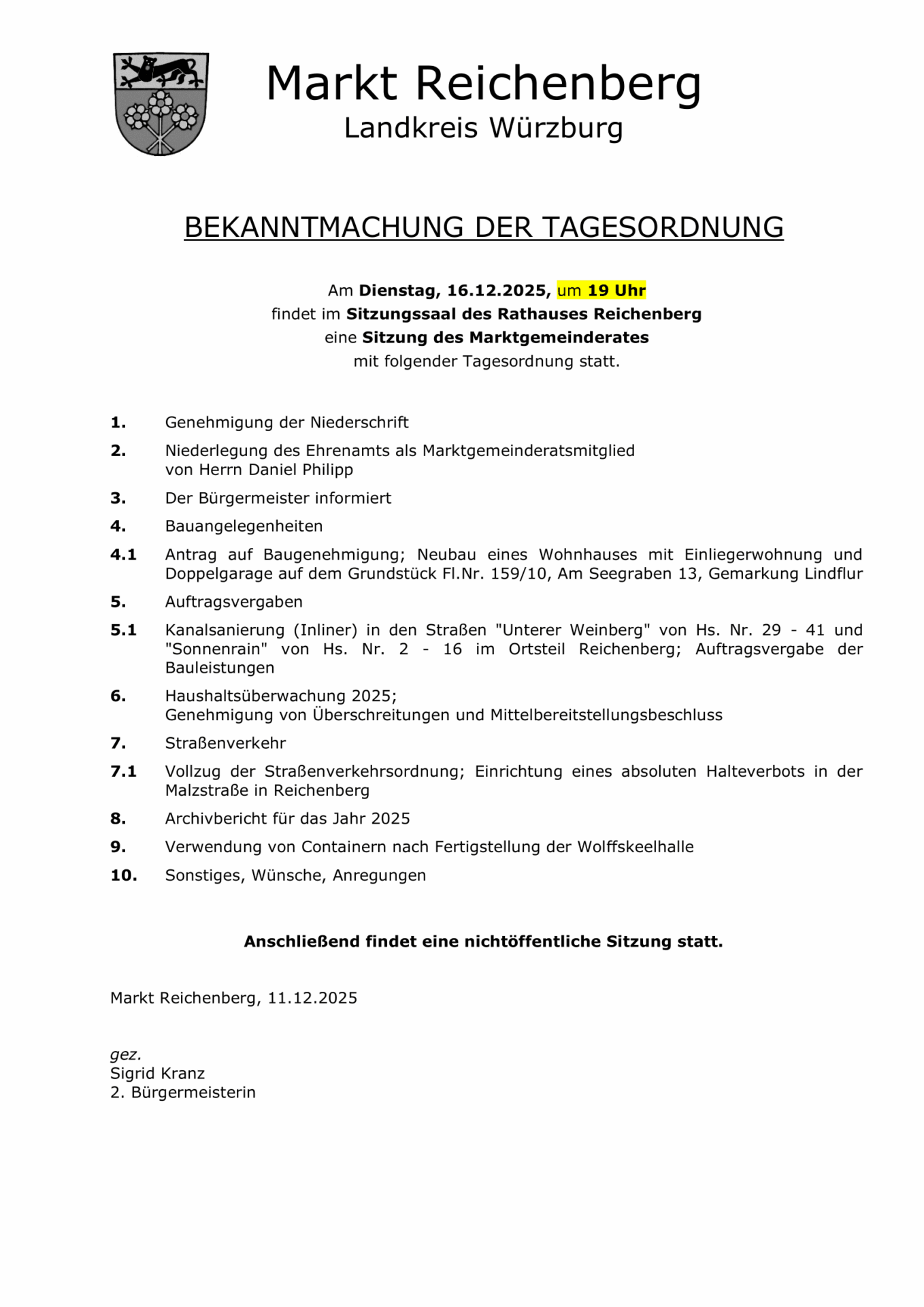 Bekanntmachung der Tagesordnung Marktgemeinderatssitzung 16.12.2025