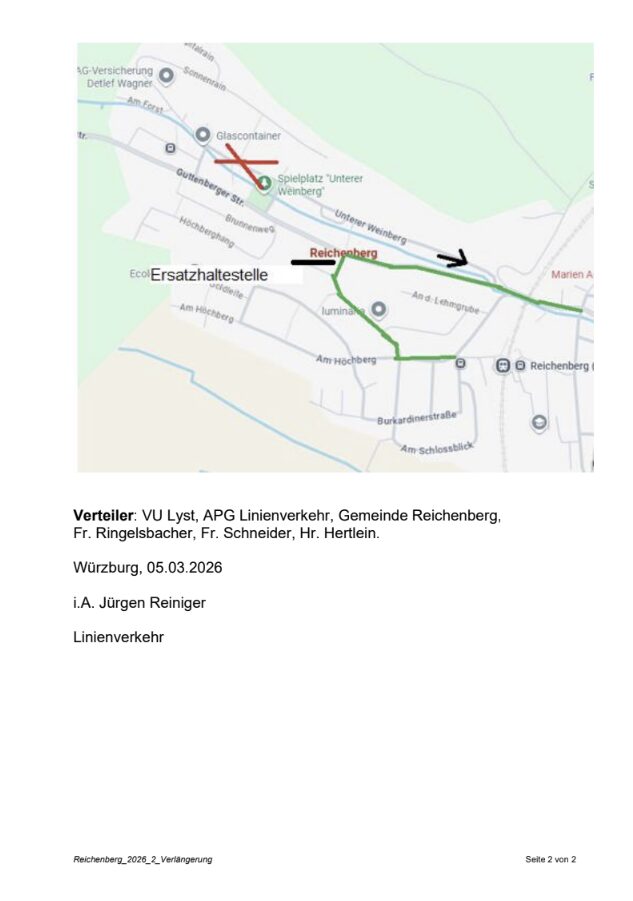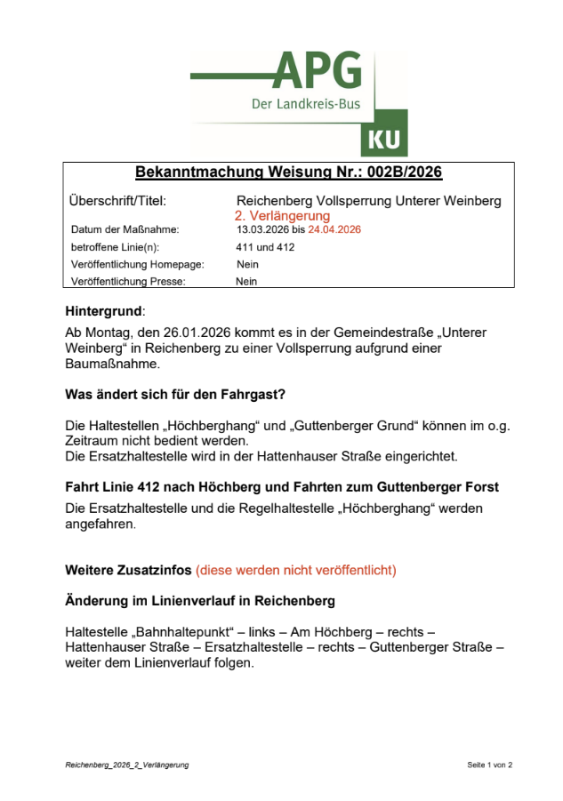 Reichenberg – Vollsperrung „Unterer Weinberg“ 2. Verlängerung 13.03. bis 24.04.2026 – Buslinien 411 und 412