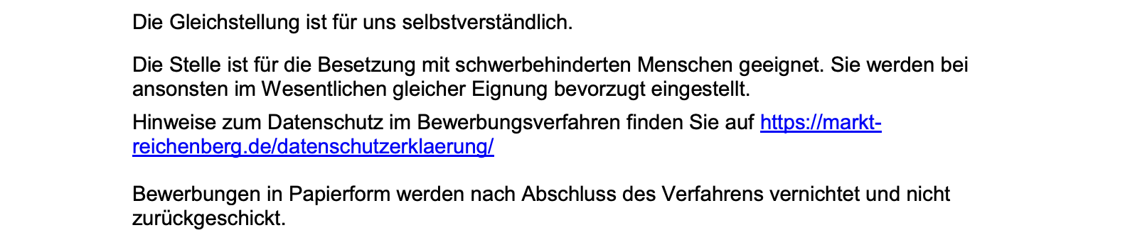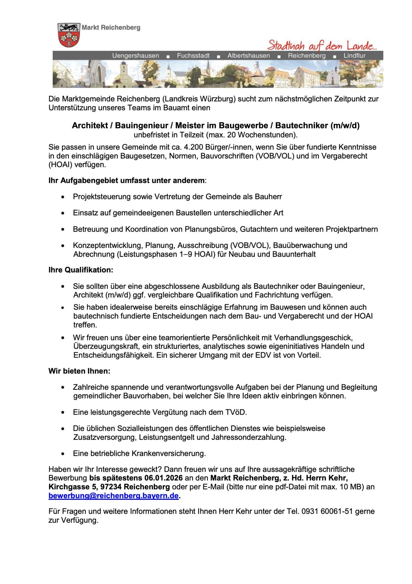 Haben wir Ihr Interesse geweckt? Dann freuen wir uns auf Ihre aussagekräftige schriftliche Bewerbung bis spätestens 06.01.2026 an den Markt Reichenberg,