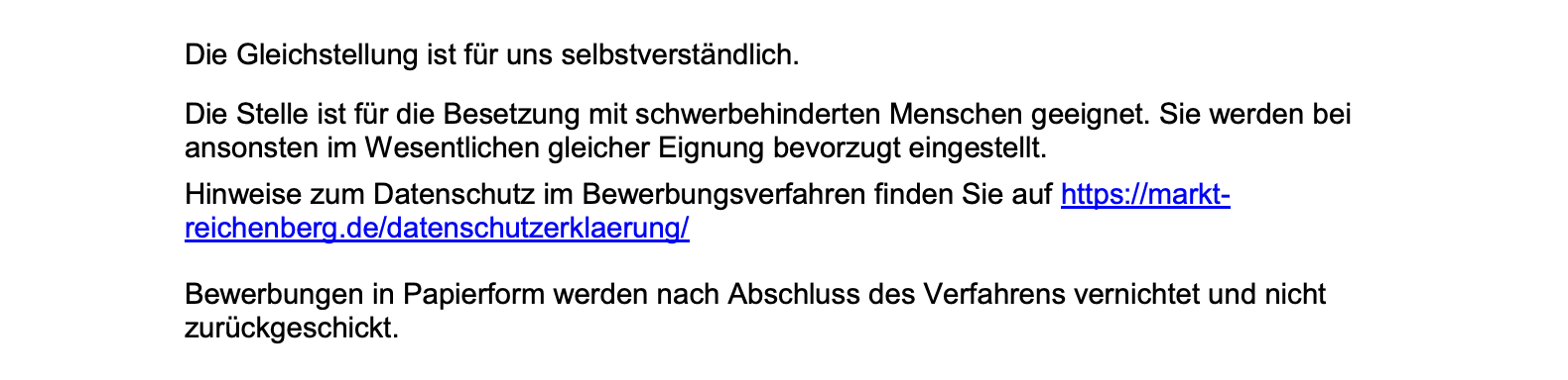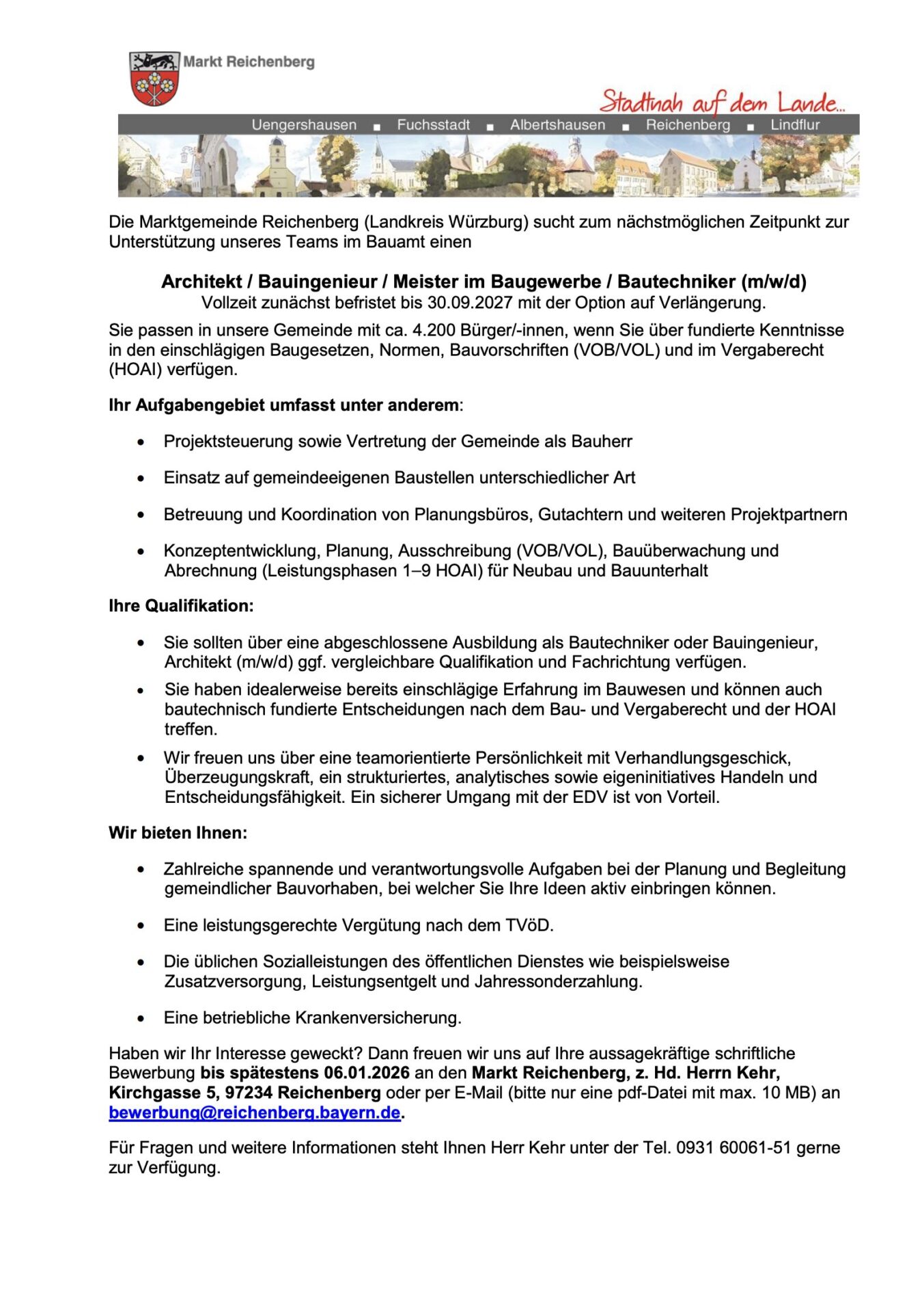 Haben wir Ihr Interesse geweckt? Dann freuen wir uns auf Ihre aussagekräftige schriftliche Bewerbung bis spätestens 06.01.2026 an den Markt Reichenberg,