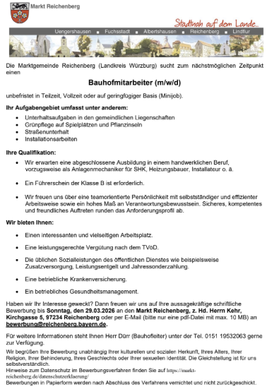 Hinweise zum Datenschutz im Bewerbungsverfahren finden Sie auf https://markt-reichenberg.de/datenschutzerklaerung/