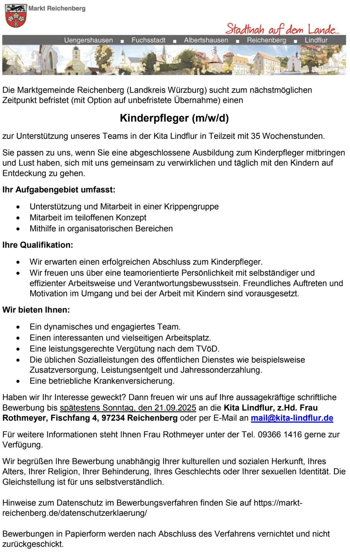 Haben wir Ihr Interesse geweckt? Dann freuen wir uns auf Ihre aussagekräftige schriftliche Bewerbung bis spätestens Sonntag, den 21.09.2025 an die Kita Lindflur, z.Hd. Frau Rothmeyer, Fischfang 4, 97234 Reichenberg oder per E-Mail an mail@kita-lindflur.de