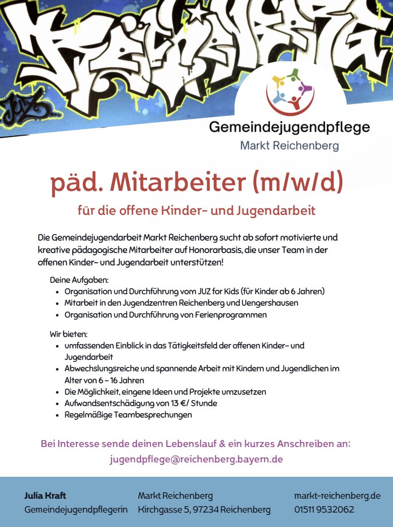 Bei Interesse sende deinen Lebenslauf & ein kurzes Anschreiben an: jugendpflege@reichenberg.bayern.de MarktReichenberg Kirchgasse 5,97234Reichenberg JuliaKraft Gemeindejugendpflegerin markt-reichenberg.de 015119532062